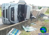 Caminhão com carregamento de chapas de madeira tomba no trevo da Castelinho