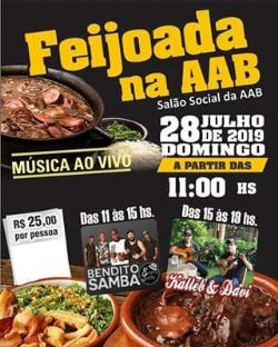 Neste domingo (28), a partir das 11h, acontece no Salão Social da Associação Atlética Botucatuense (AAB) um almoço especial onde será servido a feijoada completa, ao preço de R$ 25 por pessoa adulta. Menores de 14 anos pagam a metade do preço e bebidas serão vendidas à parte.