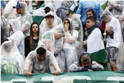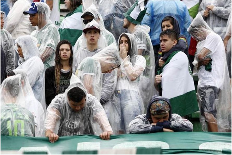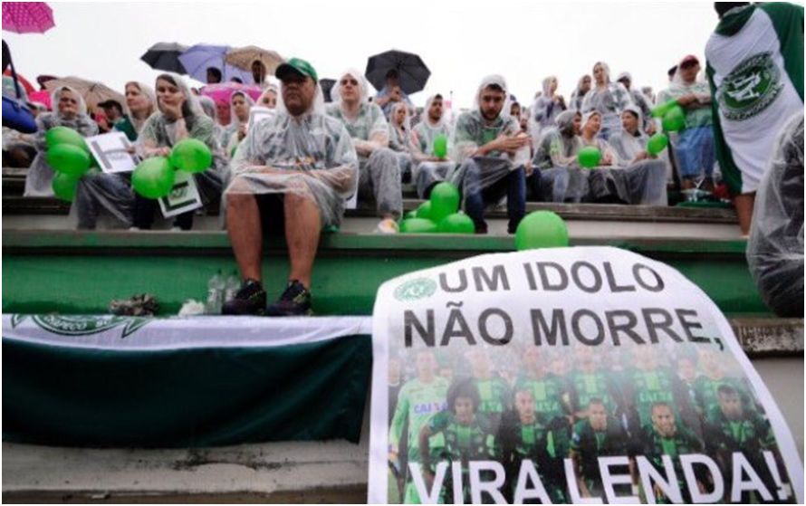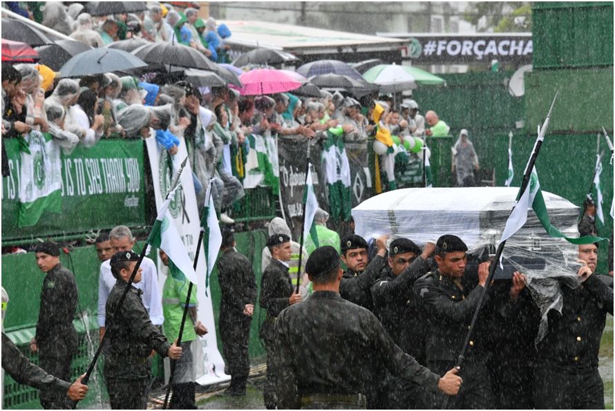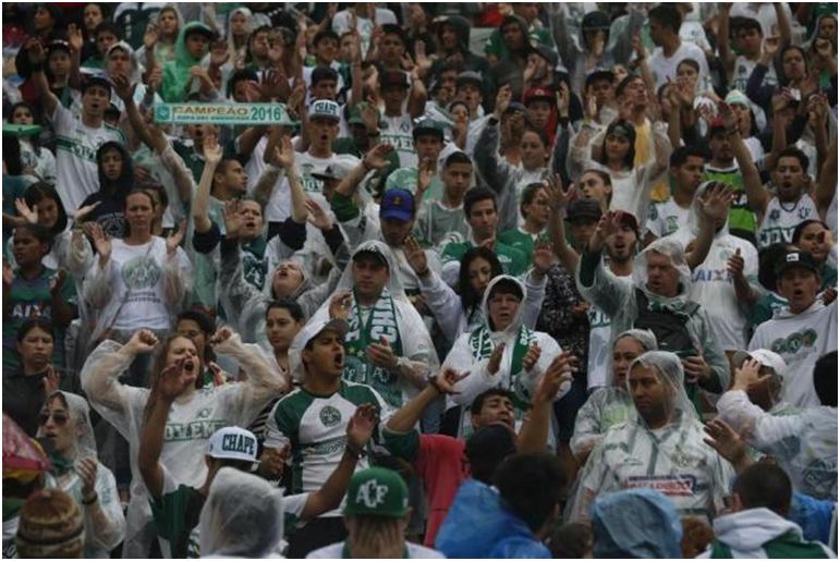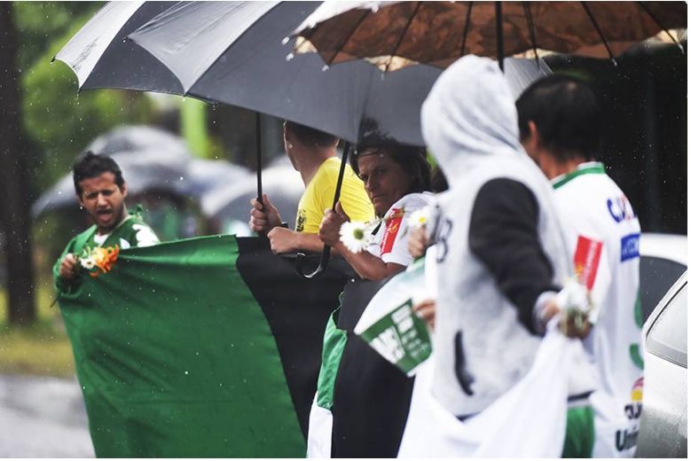 A forte chuva que caía em Chapecó não espantou o público que aguardava desde cedo a chegada dos caixões vindos de Medellín, na Colômbia, em duas aeronaves C-130 Hércules da Força Aérea Brasileira (FAB). As arquibancadas estavam lotadas de torcedores que, emocionados, se abrigaram debaixo de capas e guarda-chuvas.