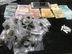 Já pelo Bairro Santa Mônica a guarnição policial abordou em via pública um cidadão já conhecido na criminalidade para uma averiguação de rotina. Com ele havia R$ 758 em dinheiro e um telefone celular. Indagado ele revelou que o dinheiro era proveniente de venda de entorpecentes e indicou um esconderijo embaixo de um monte de pedras onde havia ocultado 34 parangas de maconha e 6 pedras de crack.